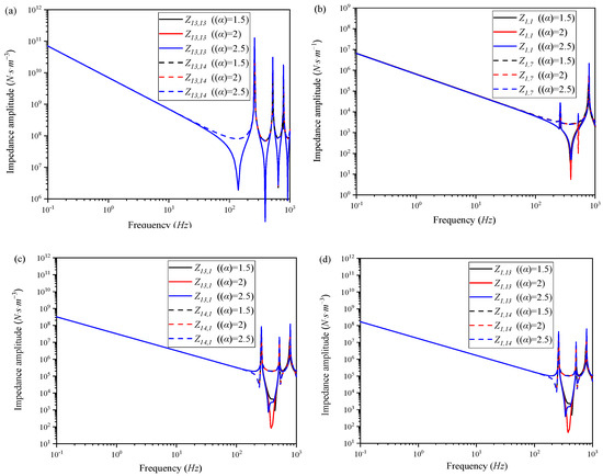α has a negligible effect on both acoustic and mechanical impedance. However, it significantly affects the coupling impedance. An increase in α correlates with a marked reduction in the first anti-resonance frequency for both input mechanical–acoustic and acoustic–mechanical impedances.