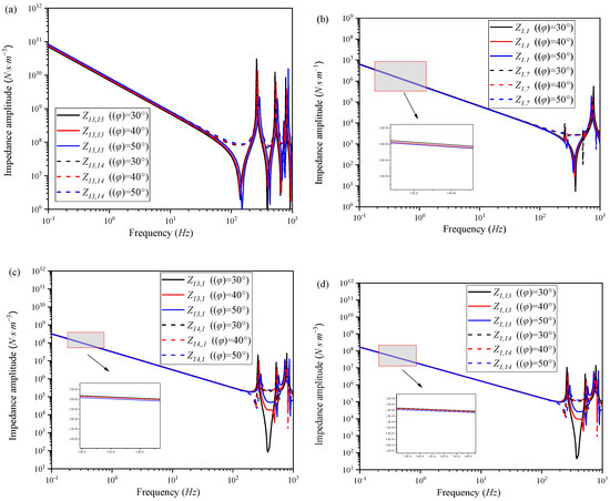 φ, the magnitude of the acoustic impedance increases, while the magnitudes of mechanical impedance, acoustic–mechanical impedance, and mechanical–acoustic impedance decrease in the low-frequency range.