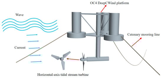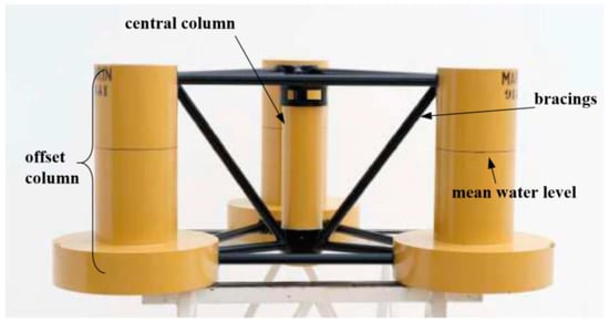 In this study, the floating tidal turbine is made up of a 1:50 scale OC4 DeepCwind platform [67], a mooring system, and a three-blade tidal stream turbine designed by Hohai University [68]. A schematic diagram of the device is given below in Figure 1.