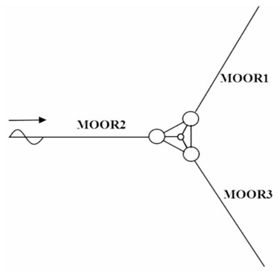 The DeepCwind floating platform achieves mooring constraints via a mooring system made up of three anchor chain lines [72,73,74]. As illustrated in Figure 4, the three anchor chain lines arranged in this mooring system are completely identical, with a 120° included angle between any two adjacent catenary lines. Specific physical parameters are detailed in Table 3. One end of the catenary is connected to the fairleads of the three main buoys of the platform. These fairleads have a draft depth of 14 m and are spaced 40.868 m from the central axis of the platform. The other end is anchored at a seabed mooring point 200 m deep, and the mooring line’s initial length is 835.5 m.
