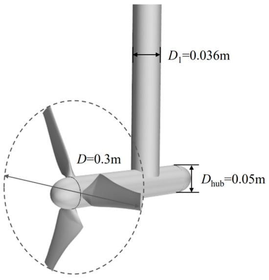 The computational model in this paper adopts a three-blade horizontal-axis tidal stream turbine model designed by Hohai University, as shown in Figure 5. The turbine has a diameter D = 0.3 m, a hub diameter Dhub = 0.05 m, and a support structure diameter D1 = 0.036 m. The designed inflow velocity is 0.4 m/s, and the rated tip speed ratio is 3.9. The blades are designed using NREL S822/S823 airfoils, with twist angles and chord length data listed in Table 4.