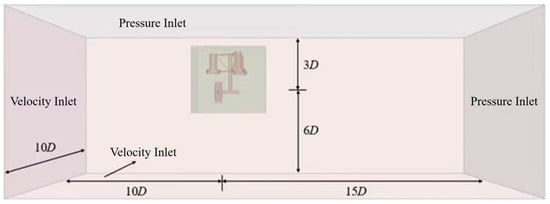 To simulate turbine rotation and the three-DoF motions, an overlapping grid technique is employed [85,86,87,88]. This requires defining a background domain, an overlapping domain, and a rotating domain. The overlapping domain must cover the entire motion range of the floating platform, and the grid sizes of the overlapping and background domains must be kept consistent. The rotating domain encloses the entire turbine model, ensuring a certain distance is maintained between the turbine model and the boundary of the rotating domain. The distance between the turbine rotation center and the inlet boundary of the background domain is set as 10D, the distance to the outlet boundary is 15D, and the distance to the top boundary is 5D. For the computational domain, the inlet, two side boundaries and bottom are all defined as velocity inlets, while the outlet and top act as pressure outlets. Additionally, a damping wave-absorbing zone is set within a one-wavelength interval the wavelength ahead of the pressure outlet boundary on the computational domain’s right side. This setup prevents wave reflection at the outlet from interfering with the motion responses of waves and the platform [89,90,91]. The detailed setting are illustrated in Figure 6.
