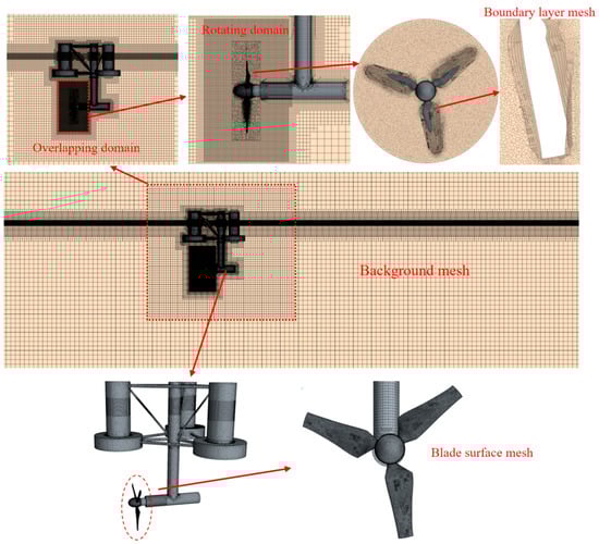 For numerical simulations, grid partitioning stands as a critical step, as the quality of the grid will directly impact the accuracy and efficiency of the calculation results [92,93,94,95]. As shown in Figure 7, the background domain adopts structured grids, and the rotating domain adopts unstructured grids. Since sliding meshes hardly achieve both rotation and free platform motion simultaneously and are prone to errors, while overlapping grids can efficiently simulate the superposition of three-degrees-of-freedom motions and simplify the pre-processing process, improving calculation efficiency and accuracy, they are utilized to simulate the combined turbine rotation and platform motion. When performing hole-cutting on the background and overlapping domains with overlapping grids, the grid sizes at the junction position need to be kept similar. The grid size at the junction position in this study is 0.025 m. Divide the boundary layer grids on the surface of the turbine, with a total of 5 layers and a thickness of 0.008 m, which meets the requirements of the y+ value range. The grid division scheme for the wave area is as follows: within the interval of a single wavelength, the number of grid cells should be set to at least 160; within the interval of a single wave height, at least 20 grid cells should be divided. The grid sizes in the X and Z directions are 0.012 m and 0.003 m, respectively, yielding a total grid count of 5.9 million.