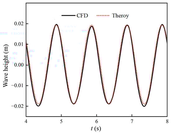 This section takes the working condition with wave height 0.04 m, wave period 1 s, and inflow velocity 0.4 m/s as an example to carry out the validity verification of the wave–current environment. The calculated results were compared with the theoretical values, as shown in Figure 8. While minor fluctuations appear in the numerical results, they align closely with the theoretical predictions overall. This phenomenon strongly confirms the effectiveness of the numerical wave simulation employed here.