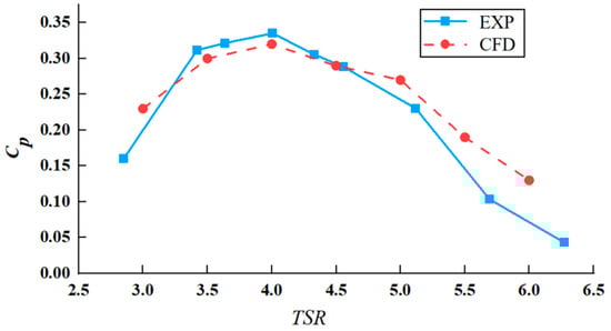 To validate the accuracy of numerical methods, this study compares the findings with the experimental results from Reference [68]. The experiment employed a T21WN high-precision torque sensor manufactured by HBM for torque measurement, with a rotational speed measurement range up to 20,000 r/min. Figure 9 illustrates the comparison between the numerical calculation values of this study and the experimental results. In this work, power coefficients were calculated for seven different λ. Analysis reveals that the numerical results of power coefficients closely match the experimental data under the optimal tip speed ratio and its equidistant offset conditions. For example, the error at the optimal λ is only 5%. However, numerical results slightly exceed the experimental values under high tip speed ratio conditions. This discrepancy may arise from intensified flow field variations around the blades as the rotational speed increases, leading to larger deviations [102]. Overall, numerical results and experimental data show consistent variation trends. In conclusion, the turbine’s CFD numerical model established using the IDDES method in this study exhibits high accuracy and can effectively predict the turbine’s hydrodynamic characteristics.