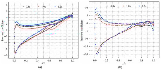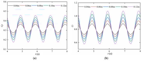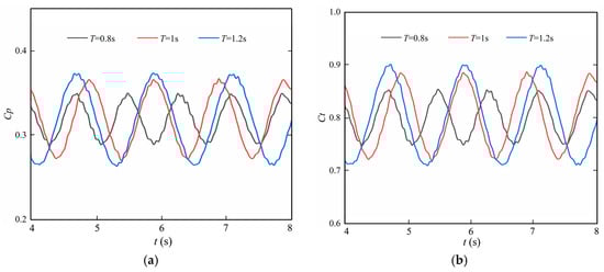 Time history curves of hydrodynamic coefficients under different wave heights. (a) Cp, (b) Ct.