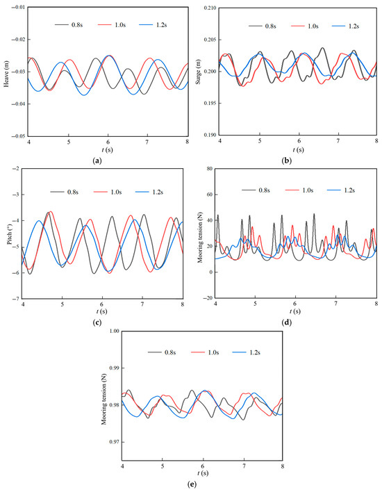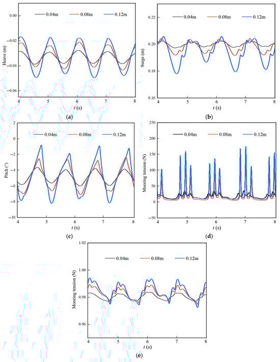 To further analyze the motion responses of the platform’s three main DoFs (heave, surge, and pitch) under different wave heights, when the platform motion tended to be stabilized, three typical working conditions were selected to be analyzed, as shown in Figure 11.