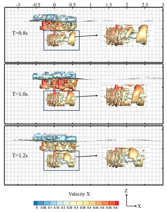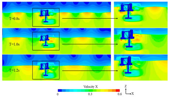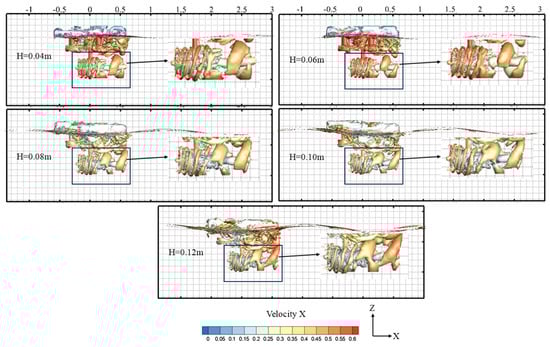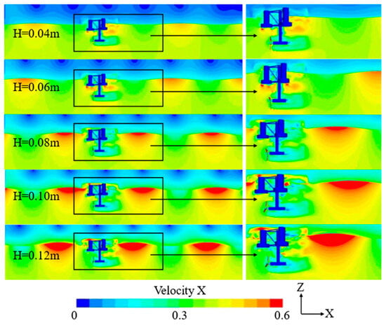 To facilitate horizontal comparison of flow field characteristics under different wave heights, the side view of the fluid domain velocity field at time T(0) (i.e., the starting point of a complete wave cycle) after the flow field has stabilized was taken, as shown in Figure 12. The left panel presents the overall planar flow field diagram, while the right panel is the magnified local flow field diagram around turbine. From the overall diagram, as wave height increases, the high-speed region of the flow field approaches the turbine and expands in scope. This is because higher wave heights introduce more energy into the flow. When the flow passes through the turbine, more energy transfers to the blades, increasing the flow velocity around the blades and causing flow turbulence, broadening the high-speed region. Moreover, wave height increases may induce wave breaking. Turbulence, an extremely complex and irregular form of fluid motion, involves vortices of various scales and velocity fluctuations. These turbulent phenomena enhance the flow velocity and complexity, thereby forming a broader red region in the velocity contour.