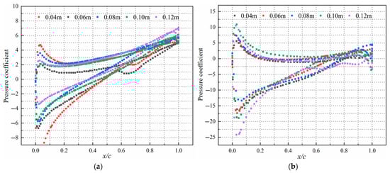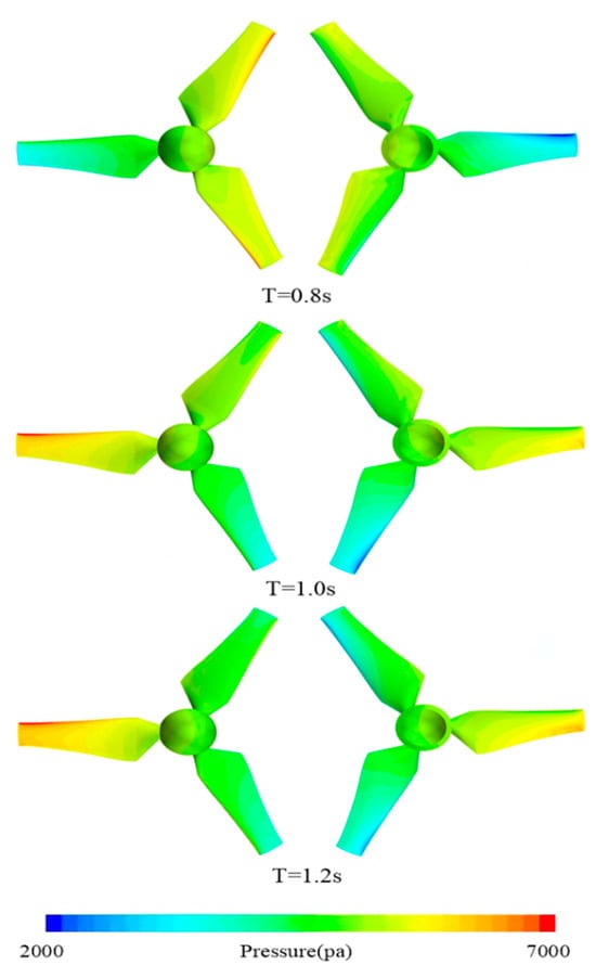 After the flow field was stabilized, the Cp and Ct time history curves for different wave height conditions during the stabilized wave period were selected for comparative analysis. As shown in Figure 10, both coefficients exhibited periodic variations. As wave height increased, their fluctuation amplitudes gradually rose. Specifically, the peak value of Cp under the maximum wave height condition was 1.25 times that under the minimum wave height, and the peak Ct showed a 1.2-fold increase. This indicates that the turbine installed on a floating platform in a wave environment may suffer from severe fatigue loads and power fluctuations.