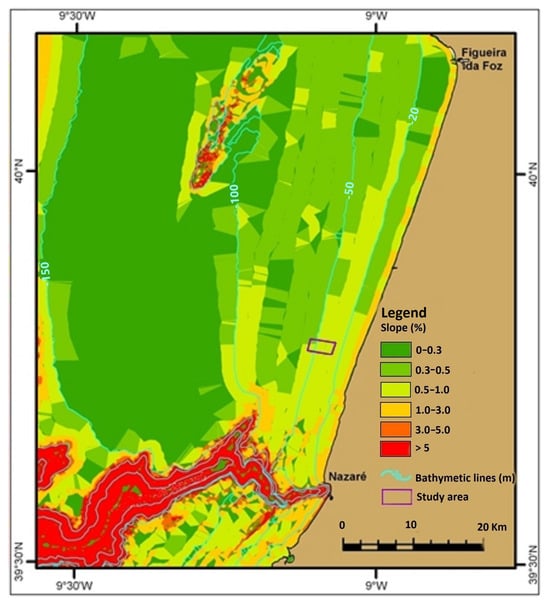 Map of offshore slopes in the region between Figueira da Foz (N) and Nazaré (S). Adapted from [24].