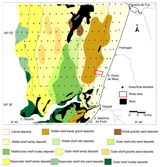 - Pombo, J. Superficial Sediments of the Portuguese Continental Shelf Between Cabo Mondego and São Martinho do Porto. Master’s Thesis, Universidade de Coimbra, Coimbra, Portugal, 2004. (In Portuguese). [Google Scholar]
