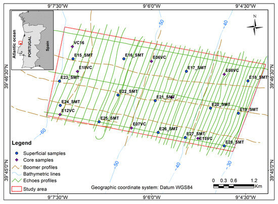 A survey was conducted by the Portuguese Instituto Hidrográfico (IH) aboard research ship NRP Almirante Gago Coutinho. The campaign involved the simultaneous acquisition of full-coverage bathymetric data using a Simrad—Kongsberg multibeam echo sounder and the acquisition of 50 high-resolution seismic profiles using the Echoes 3500 sub-bottom profiler system—Ixsea (Figure 6). In addition, a boomer system (Applied Acoustics) was also used to acquire nine supplementary seismic reflection profiles with greater penetration depth (Figure 6).