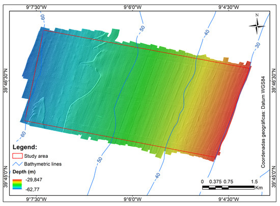 This smooth seafloor morphology observed in the study area can be attributed to the underlying geological structure, which consists predominantly of a westward-tilting monocline [32,33,34], locally disrupted by tectonic features. This structural configuration reflects the Meso-Cenozoic geodynamic evolution of the Iberian Peninsula, closely associated with the opening of the North Atlantic Ocean. Following the counterclockwise rotation of the Iberian Peninsula, the newly formed Lusitanian Basin was progressively infilled with marine and terrestrial sediments originating from the adjacent continental margin [33,34].