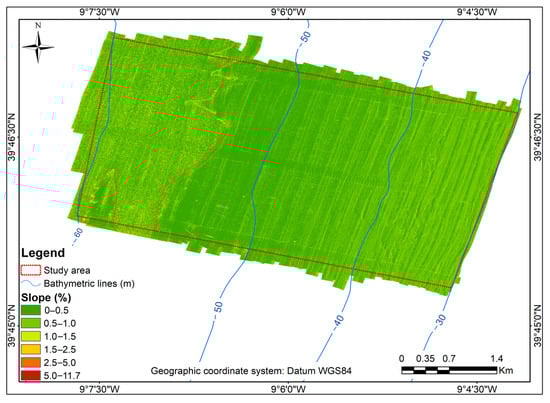 The slope map (Figure 8), derived from the DBM, confirms that the area exhibits a very gentle gradient (generally less than 1.5%) between 30 m and 55 m water depth. These values are consistent with those reported by [53,54] for continental shelf environments. At approximately 55 m water depth, a pronounced slope break is observed, where the slope exceeds 5%, indicating a morphological transition of approximately 1.0 m. This feature marks the beginning of a more irregular seabed zone, located between the 55 m and 61 m isobaths.