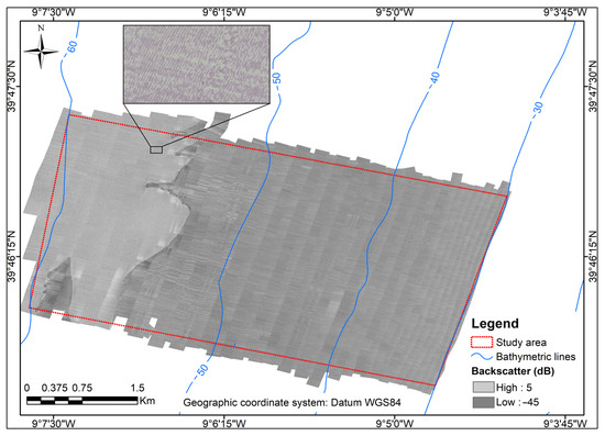 Using multibeam backscatter data, an acoustic mosaic of the seafloor was generated (Figure 9). Backscatter analysis provides a reliable method for remote acoustic classification of seafloor properties, particularly sediment type and composition [30,55,56]. Additionally, backscatter data yield insights into seafloor roughness and the presence of morphological structures such as lineations and ripples, as observed in the study area.