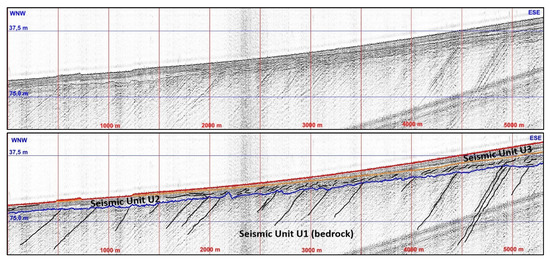 Boomer profile illustrates the structure of the study area. The upper profile shows no interpretation; the lower profile is interpreted with main reflectors and seismic unit identifications.