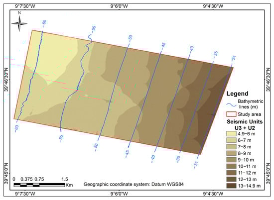 - Seismic unit U2 overlies U1 and is present across the study area. In the western sector (Figure 10), it crops out and is bounded at the top by reflector R3 (red), while in the eastern sector, it is overlain by unit U3 and capped by reflector R2 (orange). U2 exhibits strong, laterally variable reflectivity with diverse geometry. In the shallower eastern areas (between 45 m and 35 m water depths), internal reflections dip more steeply toward the south and to the mainland, while in deeper areas, they become diffused or disappear entirely (Figure 10). Thicknesses range from 5 m to 8 m (Figure 11). Internal facies variability within U2 likely reflects temporal variations in sediment transport intensity and texture. Steeply inclined reflectors (>20°) are interpreted as indicators of westward sediment transport, from the coast to deeper shelf waters.