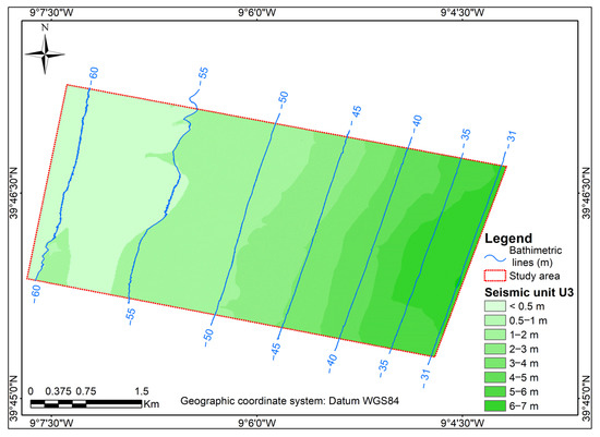 Figure 12. Thickness map of seismic unit U3: the different classes represent the thickness of seismic unit U3, in meters, measured between the seafloor and reflector R2.