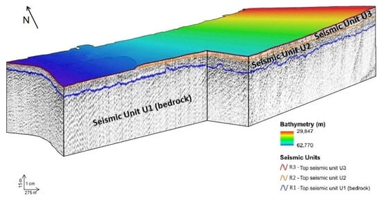 Seismic profiles were processed and interpreted following the criteria defined by [39,40,41]. A P-wave velocity of 1785 m/s [42] was applied to convert two-way travel times (TWT) into physical thicknesses of the identified seismic units.