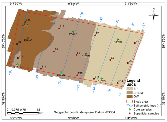 Distribution of the distinct geotechnical sediments on the study area and sampling sites.