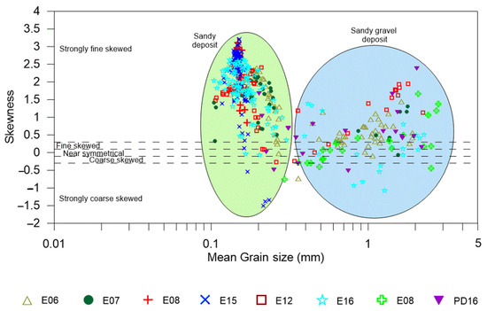 Relationship between mean grain size and skewness of the analyzed vertical soil samples. Sand deposit (green); sandy gravel deposit (blue).