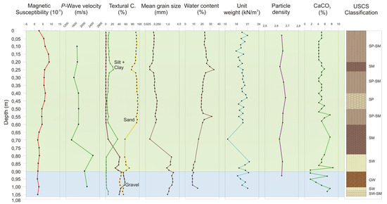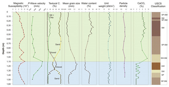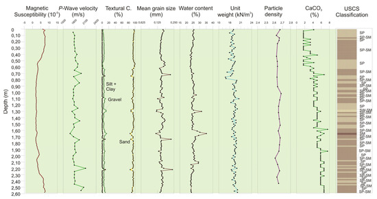 Grain size distribution was determined by sieve analysis [43] and laser diffraction [44]. Water content, bulk density, particle density, triaxial shear strength, and Atterberg limits were determined according to procedures described in [45,46,47,48,49]. Total inorganic carbon content was quantified according to [50], and magnetic susceptibility and P-wave velocity were measured following the ODP Technical Note 26 protocol [51]. Soil classification was completed using the Unified Soil Classification System (USCS), as per [52].