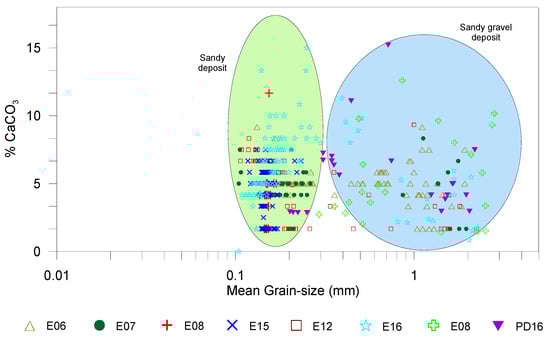 Based on McManus’s classification [36], these coarser sediments are considered relict, indicating deposition under different environmental conditions that differ from the present. This interpretation is consistent with earlier studies [37,38], and supports the hypothesis that these deposits are remnants of a paleo-littoral zone [24], likely formed approximately 10,000 years ago when the sea level was about 60 m lower than it is today [25,37].