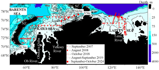 The Kara Sea (KS) and Laptev Sea (LS) are marginal seas in the Arctic Ocean. These seas are connected to each other by the Vilkitsky Strait (VStr) and Shokalsky Strait (ShStr) (Figure 1). KS and LS consist of a broad shelf, extending northward from its southern boundary to the shelf/Arctic deep basin boundary. The salinity and chemical parameter distributions in the LS are related to the Lena River inflow, photosynthesis/organic matter degradation, ice formation/melting, supply of Arctic water of Atlantic origin (ADW, Atlantic–derived water) through the shelf/deep basin boundary, and water advection from the KS through the VStr [1,2,3,4]. ADW is characterized by high-salinity (≥34.5), increased concentrations of dissolved inorganic nitrogen (DIN~ 8–10 µM), dissolved inorganic phosphorus (DIP~ 0.6–0.8 µM), and low silicic acid (DSi~ 4–5 µM) [1,2]. The Lena River discharge is characterized by high DSi concentrations (60–100 µM) [3,4]. The Lena River also transports terrestrial organic matter mobilized from extensive watersheds [4]. The thawing of on-land and sub-sea permafrost, increasing coastal and bottom erosion, and changes in river outflow could affect nutrient and carbon cycling in the LS [5,6,7,8]. Other important factors that can impact nutrient concentrations in the Arctic marginal seas are global warming [9] and the spreading of the ADW area [10,11], which lead to decreased ice extent in the Arctic Ocean.