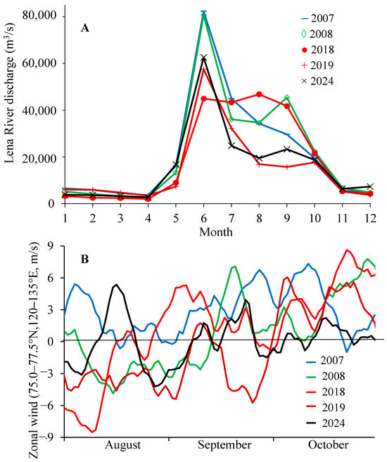 The wind direction and speed, and the fresh water supplied by rivers and ice thawing, determine the water circulation in the shelf areas of the Arctic seas during the ice-free period (from mid-July to mid-October) [22,33]. Increased river outflow and westerly winds promote the eastward Arctic Transpolar Drift [22,23,26,33,34]. In 2007, 2018, 2019, and 2024, the intra-annual variability of Lena River discharge was regular. The maximum river outflow was observed in June (81,000 m3/s in 2007/2008 and 57,000 m3/s in 2019), and it decreased to approximately 20,000 m3/s in October. In 2018, the Lena River discharge was quite uniform between June and October (42,000–47,000 m3/s) (Figure 2A).