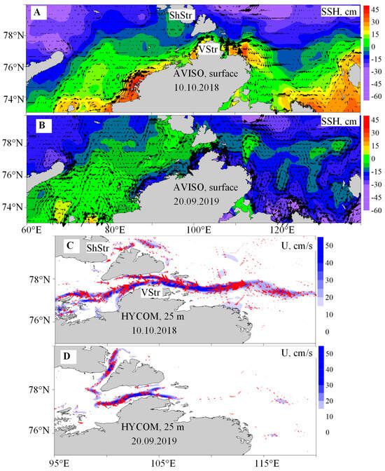 Distribution of SSH, surface geostrophic (AVISO) (A,B), and subsurface (25 m, HYCOM) (C,D) current velocity in the KS and LS during westerly (A,C) (10 October 2018) and easterly (B,D) (20 September 2019) winds. ShStr–Shokalsky Strait. VStr–Vilkitsky Strait.