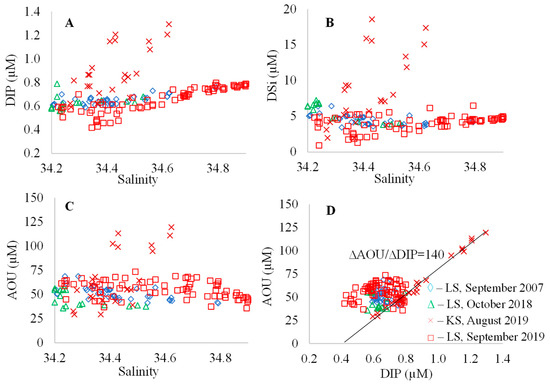 The data collected in 2007, 2018, and 2019 show that the distributions of AOU and nutrients in the 50–250 m layer (salinity of 34.2–34.9) of the LS were quite uniform (AOU = 54 ± 9 (STD) µM, DIP = 0.66 ± 0.10 µM, DSi = 4.6 ± 1.3 µM, N = 145) (Figure 4). In the subsurface layer (50–200 m) of the KS (August 2019), waters with high AOU (95–120 µM), DIP (0.8–1.3 µM), and DSi (8–18 µM) values were observed (Figure 4). The ratio between AOU and DIP changes (equal to 140) indicates that an increase in DIP and AOU in the subsurface layer of the KS was due to organic matter degradation [35].