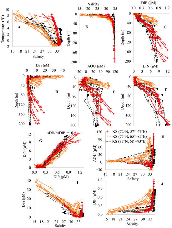 The temperature vs. salinity (A) and depth profiles of salinity (B), DIP (C), DSi (D), AOU (E), and DIN (F); DIN vs. DIP (G) and DSi (H), AOU (I), and DIP (J) vs. salinity (KS, August 2019) in the KS.