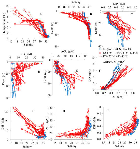 The temperature vs. salinity (A), depth profiles of salinity (B), DIP (C), DSi (D), and AOU (E); DIN vs. DIP (F) and DSi (G), AOU (H), and DIP (I) vs. salinity (KS and LS, August–September 2019 in the KS and LS.