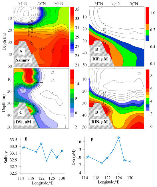 Sections of salinity (A), DIP (B), DSi (C), and DIN (D) along 126° E and sections of salinity (E) and DSi (F) along 75.5° N (bottom layer) (LS, September 2019).