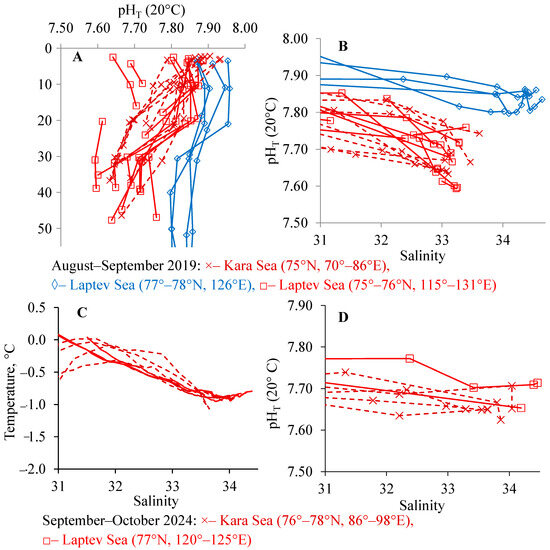 During the synthesis (destruction) of organic matter, dissolved inorganic carbon and nitrate are consumed (released), which is accompanied by an increase (decrease) in pH [35]. Low pH in the Arctic Ocean is an indicator of high seawater pCO2 and undersaturation relative to the aragonite and calcite [37]. In August–September 2019, in the KS and LS shelf areas, pHT decreased from 7.80–7.90 pH unit in the surface layer to 7.60–7.75 pH unit in the subsurface layer (depth of 30–50 m). Similar to AOU and nutrients (Figure 6), in the salinity range of 33.0–34.3, pHT in the western and central part of the LS shelf (75–76° N, 115–131° E) was equal to those in the subsurface layer of KS shelf (75° N, 70–86° E) (Figure 8A,B). In the deeper part of LS (77–78° N, 126° E), pHT was higher than pHT in the central shelf of LS by about 0.15 pH units.