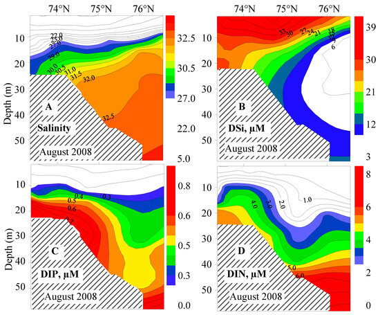 The lower boundary of the euphotic layer in the LS and KS in summer ranges from depths of 14–35 m (inner part of the shelf) to 40–70 m (continental slope and deep basin) [24,25,39]. In the coastal part of the KS shelf, light-absorbing substances, such as colored dissolved organic matter (CDOM), have high concentrations in the river plume and limit the depth of the euphotic zone [40]. CDOM input to satellite-derived chlorophyll concentrations in the KS [25]. High chlorophyll/CDOM concentrations in the surface layer of the KS shelf in June–August (Figure S1) prevented photosynthetically active radiation (PAR) penetration into the subsurface layer, resulting in the shallow (≤20 m) lower boundary of the euphotic layer [25]. It suppresses photosynthesis and thereby promotes nutrient accumulation in the subsurface layer of the KS shelf (75° N, 66–85° E; depth of 30–50 m). In addition, water exchange with the deep shelf could lead to increased concentrations of nutrients and AOU in the subsurface layer of the middle shelf. The high values of DSi, DIP, and DIN in the KS shelf zone are related to the decomposition of the freshwater diatom phytoplankton supplied from the Ob River estuary (Obskaya Guba, area of 44,500 km2) [36,41]. In early summer, high primary production and phytoplankton biomass were observed in the frontal zone of the KS (salinity of 11–16), separating the estuarine zones (Ob and Yenisey rivers) with salinity of 0–2 and the marine zone with salinity of 27–33 [42]. A large biomass of freshwater diatom phytoplankton forms during spring bloom, dies, and accumulates in the bottom layer of KS areas with high-salinity surface water. In the shallow part of the KS shelf, regenerated nutrients are quickly assimilated by phytoplankton, and in the deep part of the shelf, the increased content of these elements persists for a long time: at least for most of the fall [36,41].