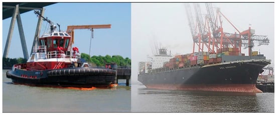 Container port berthing supported by tugboats (https://youtu.be/5hVCQWhjinY?feature=shared/; accessed on 15 July 2025).