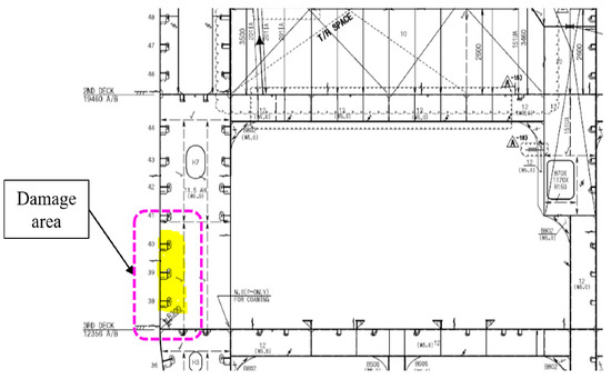 Figure 5 presents a detailed structural drawing of the stern region, highlighting the specific location and extent of the damage area subjected to collision-induced loading. The drawing delineates the geometry of the transom and surrounding shell plating, including the arrangement of internal stiffeners and web frames near the point of impact. This schematic serves as a reference for correlating observed damage patterns with structural components and facilitates the mapping of stress concentration zones during finite element simulations. The annotated region corresponds to Frame 76, specifically around the third deck (12,356 A/B), which is critical due to its proximity to propeller openings and rudder supports areas known to possess geometric discontinuities that amplify stress during eccentric tugboat impacts.