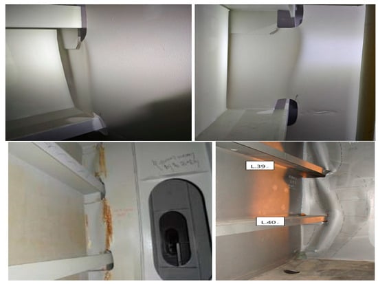 Figure 6 illustrates representative cases of plastic deformation observed in the inner web plate structures, based on field inspection of actual damage from tugboat collisions. The deformation patterns include buckling and denting phenomena concentrated around connection nodes between longitudinal stiffeners and web plates. These deformations indicate that the applied loads exceeded the local yield limit of the AH36 steel material, which is consistent with plastic strains surpassing 0.2%. The figure provides photographic and schematic evidence of three main failure mechanisms: