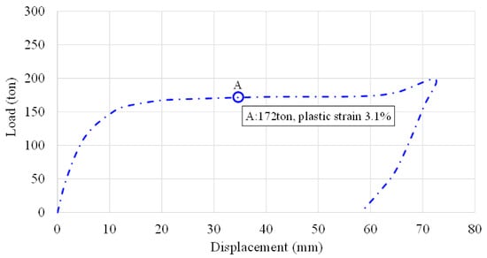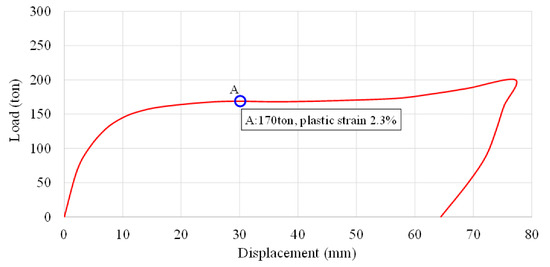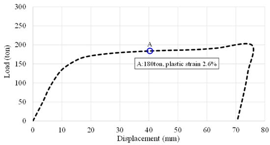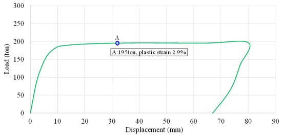 Figure 13 shows the load–displacement response under Case-2, which involves a slightly altered load distribution reflecting a more vertically biased contact from the tugboat. The initial linear segment indicates elastic behavior, followed by a gradual transition into the plastic region as the structural stiffness reduces due to localized yielding. Compared to Case-1, the curve demonstrates a marginally greater permanent deformation, suggesting that this particular load orientation results in more severe strain localization, especially near structural discontinuities in Figure 14. After reaching the peak load of 200 tons, the system unloads, revealing the magnitude of irreversible displacement retained in the structure.
