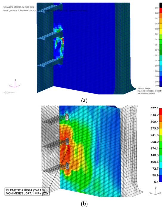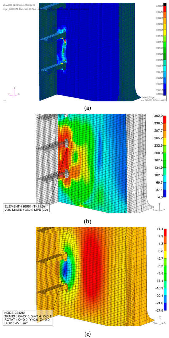 Compared to the displacement behavior of other cases (e.g., Case-2 and Case-4), the Case-5 curve shows a sharper post-yield drop in stiffness, implying that the load is not sufficiently distributed, and thus leads to stress concentration in a confined region. Unlike the gradual flattening of the curve in Case-4 due to distributed pressure over a wider contact area, the concentrated internal load in Case-5 generates a brittle-like load drop, making the system prone to sudden structural instability under continued force. This type of load–displacement curve behavior reflects a high-risk condition for structural integrity especially in regions not originally designed for primary load transfer underscoring the importance of proper load path design and internal reinforcement against unintended internal loading, such as wire tension or rigging-induced stress. In Case-5, the load is no longer applied externally. Instead, the 200 ton force is simulated as a tension force transmitted through wire ropes directly to the internal web plate of Frame 76. This scenario reflects damage modes that may arise during internal lifting, towing, or lashing operations, or even structural misalignment during dry dock procedures. The initial response is relatively stiff due to the internal application point bypassing outer shell deformation. However, once yielding initiates, the structure experiences rapid strain accumulation, with a more pronounced residual offset than in Case-4, suggesting higher local plasticity. The peak load at Point A reaches 1.6–1.8%, indicating severe plastic strain localization concentrated within the web plate as shown Figure 20a.