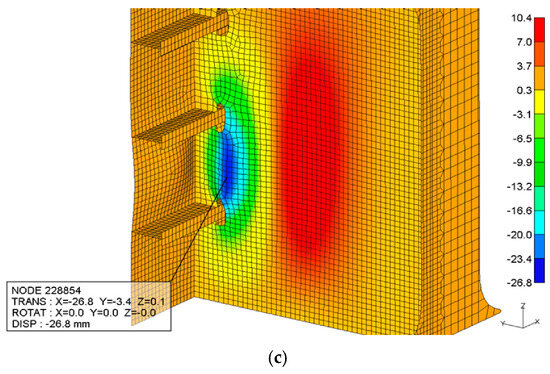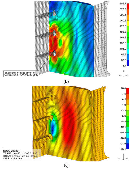 Figure 12a illustrates the distribution of equivalent plastic strain at Point A. The results confirm that localized plastic deformation has occurred, with strain values exceeding the 0.2% yield threshold of carbon steel. This validates the hypothesis that the applied loading scenario is sufficient to induce permanent deformation in the observed region. The plastic strain contour reveals a concentrated zone of high strain near structural discontinuities, including stiffener intersections and weld seams, where stress intensification naturally occurs. Figure 12b presents the von-Mises stress distribution, highlighting the areas where the equivalent stress approaches or exceeds the material yield strength. The maximum stress at Point A closely aligns with the plastic strain field, further supporting the structural vulnerability of this region under eccentric impact. The stress contours exhibit gradient transitions from high-stress zones near the contact area to relatively unloaded regions, demonstrating realistic load transfer through the surrounding structural framework. Figure 12c depicts the deformed shape of the structure against tugboat collision. The visualization shows a permanent indentation consistent with the dent depth measured in the field, affirming the fidelity of the nonlinear model. The deformation is concentrated around the transverse web and shell plating adjacent to Point A, capturing both global bending and local panel distortion. This confirms the model’s capability to replicate the actual failure mode, bridging the gap between numerical prediction and physical damage.