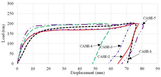 Figure 21 presents a consolidated view of the load–displacement responses derived from nonlinear finite element analyses across five distinct impact scenarios. While each case was subjected to an identical peak impact force of 200 tons, the resulting displacement behaviors reveal clear divergences in structural response owing to variations in load orientation, application method, and contact area. This comparison offers critical insights into the nonlinear sensitivity of the stern structure and helps to identify which load condition most accurately replicates the actual damage recorded during field inspections.