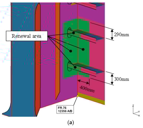 This inherent structural redundancy validates the deferral of repairs to the next scheduled dry-docking (12-month interval), per IACS UR Z10.2 (damage tolerance requirements, [23]). The renewal area (Figure 23) encompasses a 300 mm × 400 mm section with embedded T-bar stiffeners. Replacement plates will be fabricated with 2 mm over-thickness [23] to compensate for weld-affected zone softening. The 1.0% plastic strain threshold was established as the minimum criterion for component renewal because it exceeds the elastic recovery limit of marine-grade steels (e.g., AH36/DH36). Beyond this point, materials undergo irreversible microstructural changes that compromise fatigue life and load-carrying capacity. Conversely, the upper bound of 4.4% strain was selected because it approaches the uniform elongation limit of typical shipbuilding steel (5~7%), where localized necking and ductile tearing initiate. This dual-threshold approach ensures removal of critically damaged material while preserving structurally sound regions.
