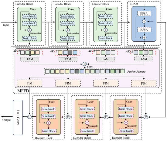 We propose MCFR-Net, an efficient underwater image enhancement network, as shown in Figure 1. MCFR-Net adopts the classic U-shaped structure and introduces basic blocks in the encoding and decoding stages to achieve stable and efficient feature extraction and conversion. Firstly, the input image undergoes multiple encoder blocks to progressively extract features, where each encoder block consists of a stack of basic blocks. The extracted features of each scale pass through the AFAE module, which uses KFSA to aggregate local and global features to enhance the feature expression of key regions effectively. Then, we introduce the RDAM, which further strengthens the feature expression of key regions through two KFSA and residual connections, retaining the original information and enhancing the stability and robustness of features. After that, the MFFD module performs channel mapping and scale alignment of the enhanced features at each scale, and splices and fuses the features in the channel dimension. The fusion features are passed through Feature Integration Modules (FIMs) to reconstruct multi-resolution details in parallel, and restored to the original resolution by stepwise decoding and upsampling.