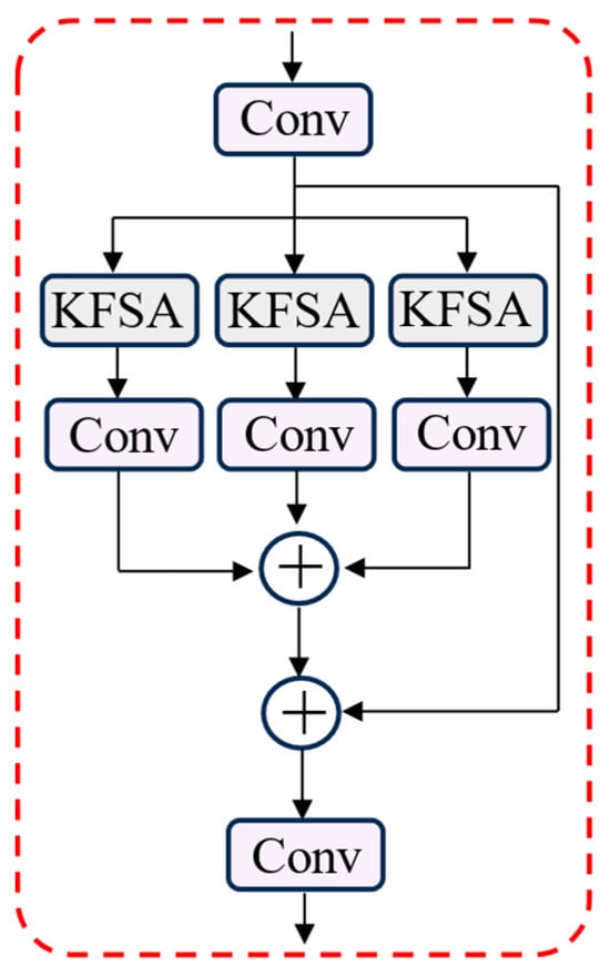 As shown in Figure 2, the AFAE module first uses a 1 × 1 convolution, batch normalization, and an SiLU activation function to map the input feature maps to the intermediate feature space. Then, it adopts a multi-path feature fusion strategy, which contains an unprocessed residual branch to retain the original features, and three enhanced branches processed by KFSA to obtain enhanced features.