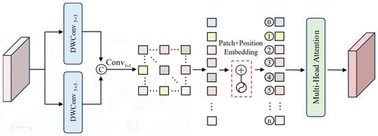 Then, the two convolutional features and are concatenated along the channel dimension, followed by a 1 × 1 convolution channel fusion, batch normalization, and ReLU activation function, obtaining multi-scale fusion features.