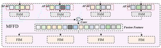 We propose an efficient MFFD module, as shown in Figure 4, which integrates the features of the coding layer globally by multi-dimensional feature fusion. This module can make the feature expression more stable in the decoding process, and ensure that the enhanced image has a complete global structure and rich local details. The MFFD module first preprocesses the encoded features of different levels through AFAE modules to enhance their semantic expression. After that, each enhanced feature is fed into the Feature Alignment Module (FAM). The specific operations are as follows: