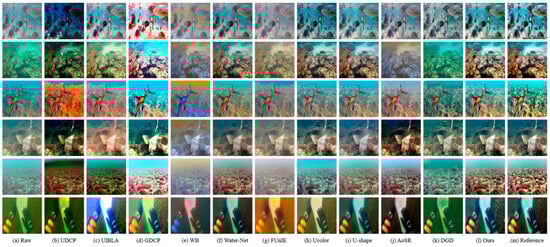 For the R90 dataset, as shown in Figure 5, the enhancement effects of each method are significantly different. In traditional methods, UDCP results in significantly darker images. Although UIBLA alleviates the blur of water bodies to some extent, it fails to effectively improve the image. The GDCP method improves the brightness while introducing obvious color distortion. The unnatural color cast problem of the WB method stands out, especially for the image in the third row. Among the deep learning-based methods, WaterNet and U-shape perform better in color and detail recovery. FUnIE introduces an orange texture. Ucolor is more accurate in overall color restoration, but there are deviations in some details. AoSR and DGD have a limited effect on image enhancement. AoSR fails to significantly improve the problem of detail blur. And DGD fails to significantly improve the color distortion. In contrast, the enhanced image of our proposed MCFR-Net is closer to the reference image, especially in the first, second, and fifth rows, and the visual effect of the enhanced image of MCFR-Net is significantly better than that of other methods.