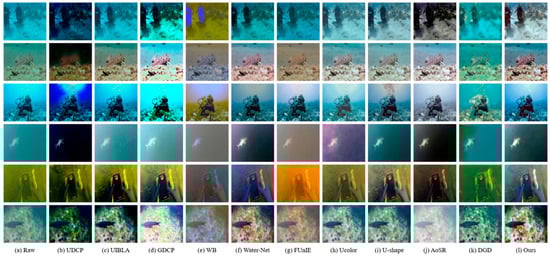 Underwater imaging plays a crucial role in the fields of ocean exploration [1], environmental monitoring [2], underwater autonomous navigation [3], underwater archaeology [4], etc. [5,6,7]. However, underwater imaging is affected by factors such as water turbidity and illumination changes, resulting in problems of contrast reduction, color distortion, and blurring degradation [8,9,10]. Unlike the land environment, the absorption and scattering effects in the underwater environment hurt the visual quality, leading to significant degradation of acquired underwater images, which hinders the execution of advanced computer vision tasks such as target recognition and scene understanding. Therefore, the development of high-performance UIE methods is crucial for subsequent missions.